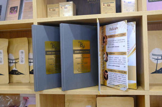 Một vị khách lần đầu bước vào tiệm. Họ chưa biết gì nhiều về tay nghề, chưa trải nghiệm dịch vụ, nhưng khi bàn tay họ chạm vào chiếc menu bọc da mềm mại, góc mạ vàng sáng bóng, bìa bóng kính sang trọng như một ấn phẩm cao cấp – họ lập tức có cảm giác "Ở đây, mọi thứ đều ở đẳng cấp khác."